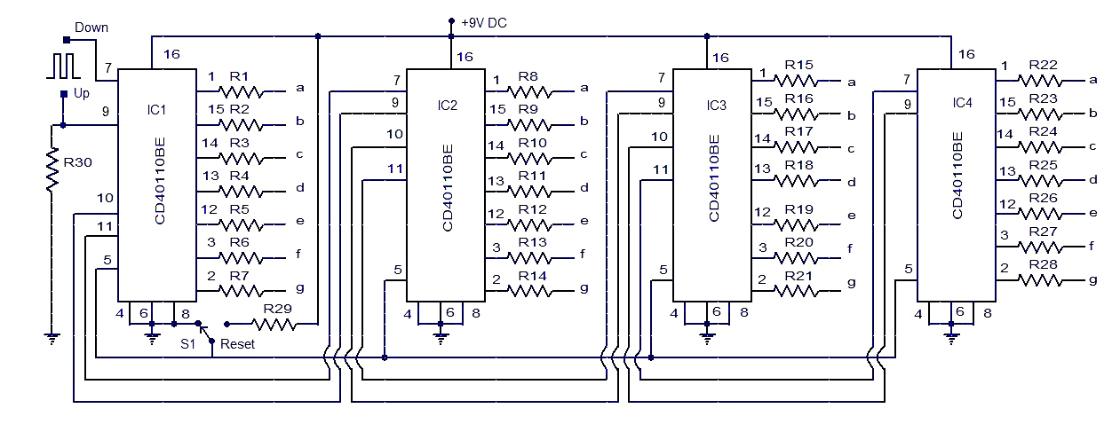 Here is the circuit diagram of a seven segment counter based on the counter IC CD 4033. This circuit can be used in conjunction with various circuits where a counter to display the progress adds some more attraction.