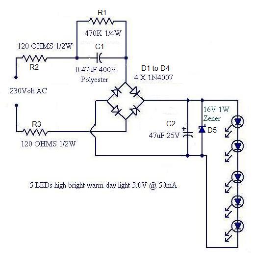 This is just a LED lamp circuit that can be operated from the mains voltage. A string of five LED is driven using a capacitive transformer less power supply. In the circuit 0.47uF/400V Polyester capacitor C1 reduces the mains voltage. R1 is a bleeder resistor which drains the stored charge from C1 when the AC input is switched OFF. Resistors R2 and R3 limits the inrush of current when the circuit is switched ON. Diodes D1 to D4 forms a bridge rectifier that rectifies the reduced AC voltage and C2 acts as a filter capacitor. Finally Zener diode D1 provides regulation and the LEDs are driven.