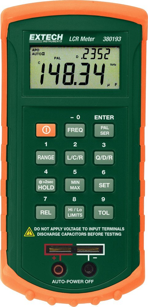 Extech 380193 supports the measurement of Inductance, Capacitance, Quality Factor and Dissipation Factor. It allows measurement in Series and Parallel mode, however, the frequency of measurement is limited to 120Hz and 1kHz. This meter can be used for sorting components by specifying the acceptable range. For improving accuracy and reducing the error it provides a facility for calibration. The short and open calibration facility removes stray components added by the measuring system. Extech 380193 allows display of the average, minimum and maximum value for a set of measurements and also provides the RS232 interface for sending measurement data to a spreadsheet on PC. This helps to make an easier analysis of measurements. It supports dual display – displays secondary parameter (D, Q etc) along with primary parameter (Capacitance, Inductance etc). It has the backlight feature for better readability of measurement.